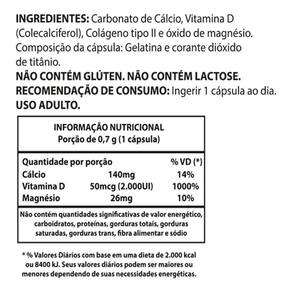 Carbonato de Cálcio, Vitamina D Colecalciferol , Colágeno Tipo II, e óxido de magnésio.
