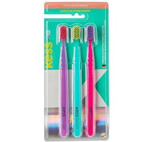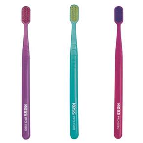 As escovas da linha Kess Pro possuem: Alta eficiência na escovação- tem o maior número de cerdas de alta qualidade que garantem limpeza profunda dos dentes, projetadas para alcançar até mesmo os espaços mais difíceis, alcançando áreas inacessíveis pelas escovas comuns. Garantindo limpeza completa. Cerdas extra macias e ultrafinas que proporcionam uma escovação gentil. A estrutura única das cerdas neutraliza a força excessiva, protegendo ainda mais as gengivas Design Moderno, estético e funcional com cabo reto e cabeça angulada Economia: Pack triplo para maior durabilidade acompanha capa protetora de cerdas. Proporciona precisão e conforto na escovação.