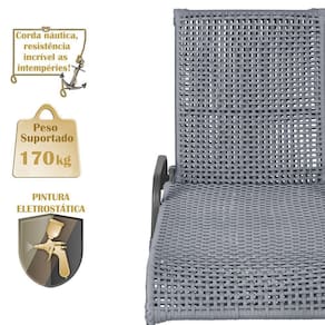 Produto conhecido como: Espreguicadeira reclinavel, Espreguicadeira em aluminio, Espreguicadeira com encosto ajustavel, Espreguicadeira para area externa, Espreguicadeira para piscina, Espreguicadeira resistente ao tempo, Espreguicadeira moderna, Espreguicadeira confortavel, Moveis para area externa, Moveis de aluminio para jardim, Corda nautica para moveis, Espreguicadeira leve e duravel, Design sofisticado para areas externas, Decoracao para varanda e piscina, Espreguicadeira resistente ao sol e chuva.