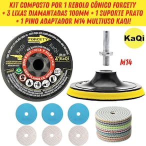 3 Lixas Grão 4 Pol. 100mm Diamantada + 1 Rebolo Cônico 45 Graus + 1 Disco Prato + 1 Pino M14 KaQi GRÃO: g50 g400 g3000 Kit 3 Lixas Diamantadas Disco 4 Polegadas 100mm KaQi + 1 Rebolo Grão 120 Copo Cônico 45 Graus 4 Polegadas M14 Forcety. + 1 Suporte Prato Disco 100mm M14 KaQi + 1 Pino Adaptador Multiuso Rosca Universal M14 KaQi. Para Desbastes, Polimentos, Acabamentos, Boleamentos, Lixamentos a Seco e Úmido. Ideal para profissionais e entusiastas de reformas e construção. Transforme o acabamento das suas superfícies com o Kit 3 Lixas Grão 4 Pol. 100mm Diamantada + 1 Rebolo Cônico 45 Graus + 1 Disco Prato + 1 Pino M14 Desenvolvido para oferecer o melhor polimento e acabamento, é perfeito para quem busca resultados profissionais, tanto em pedras como granitos, mármores, cerâmicas, quanto ardósia, calcário, dekton, quartzo, porcelanato, pedra projetada, concreto, nanoglass, super nano, vidro e muito mais. Seu lixamento pode ser a seco e a úmido, o que proporciona um processo mais rápido, sem gerar calor excessivo. Assim, é possível garantir um resultado sem manchas ou falhas, e ainda favorece um efeito brilho d'água incrível O Rebolo Copo Cônico 10x5cm Grão 120 Forcety é ideal para desbastes, retificações, boleamentos e acabamentos. Projetado para oferecer eficiência, durabilidade, confiabilidade e resultados excepcionais, é perfeito para profissionais e entusiastas de reformas e construções. Não à toa, é o rebolo número 1 das marmorarias, azulejistas e oficinas de todo Brasil O Disco 100mm e o pino adaptador M14 podem ser utilizados em conjunto com as lixas e com o rebolo. Com sistema de gruda e desgruda fácil, podem utilizadas em lixadeiras, esmerilhadeiras, politrizes, furadeiras, parafusadeiras. Permite, assim, ampliar a ampla variedade de usos do kit. Principais características: 1. Durabilidade extra, alta resistência ao desgaste, longa vida útil e desempenho, além de excelente performance em diversos tipos de materiais. 2. Acabamento impecável no desbaste e polimento de superfícies de pedra, mármore, calcário, ardósia, porcelanato e outros, sem deixar manchas ou marcas indesejadas. Pode ser trabalhada em superfícies claras ou escuras. Oferece uma remoção eficiente de material e um acabamento uniforme. 3. Versatilidade no uso com diversas ferramentas, já que pode ser Utilizado em esmerilhadeiras, lixadeiras, politrizes e furadeiras elétricas. 4. Eficiência de montagem, uma vez que possui sistema de fixação rápido. Basta encostar a lixa no suporte do disco para grudar, e, para remover, é só puxar na direção contrária. Conteúdo da embalagem: 3 Lixas DÁgua 4 Pol. 100mm Disco Diamantado KaQi GRÃO. + 1 Rebolo Grão 120 Copo Cônico 45 Graus 4 Polegadas M14 Forcety. + 1 Suporte Prato Disco 100mm M14 KaQi + 1 Pino Adaptador Multiuso Rosca Universal M14 KaQi. Especificações Lixas: Diâmetro: 100mm  4 Polegadas . Furo central: 1,3cm diâmetro. Espessura 1 unidade: 0,4cm. Maleabilidade: flexível. Lixamentos: seco e úmido. RPM: ideal entre 3000 a 5000 rotações por minuto. Material da lixa: diamante sintético industrial e resina premium. Costado: tipo vellcro. Fácil de fixar e remover. Especificações Rebolo: Trabalho: a seco ou refrigerado com água. Diâmetro: 4 Polegadas 100mm  10,16cm  x altura 5,08cm. Velocidade: 9023RPM. Rosca: M14. Material: Carbeto de Silício  SiC  com diamantes. Norma ABNT NBR 15230. Especificações Prato Suporte: Diâmetro do disco: 100mm  4 Polegadas . Modelo do disco: M14 com superfície tipo vellcro. RPM: até 12000. Rosca: padrão M14  14mm . Especificações Pino Adaptador M14: Para Furadeira Parafusadeiras, Politrizes, Lixadeiras e Esmerilhadeiras. Fixa em discos pratos M14 para uso com lixas, boinas, espumas de polir, entre outros acessórios. Rosca: M14  14mm . Pino largura: 8mm. Altura total: 4,4cm.