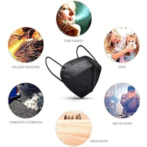 - Camadas de microfibras sintéticas, elemento filtrante com tratamento eletrostático, clipe nasal e elástico de poliéster, poliamida e elastano.