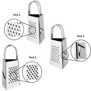3 Mini Ralador 3 Faces Inox Alça Dupla Queijo Legumes Frutas 3 Mini ralador inox com 3 faces e alça dupla resistente.