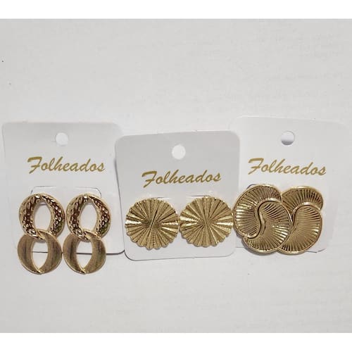 Este elegante kit com 2 pares de brincos em formato moderno e atual na cor dourada folheado em ouro 18k com 3 x 2 cm e 3,5 x 2 E 2 X 2 cm aproximadamente bijouterias feita em material com boa durabilidade e um brilho encantador. Com um design clássico, é uma peça versátil que pode ser usada em diversas ocasiões, desde eventos formais até no dia a dia. Seu tamanho médio oferece um equilíbrio perfeito entre sutileza e sofisticação, adicionando um toque de elegância ao seu visual. Ideal para quem aprecia acessórios refinados e atemporais. São 3 códigos juntos BRI001 BRI002 BRI003 E124P02