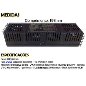Compatibilidade: Modelos de lâmpadas: T10 T12 Quantidade de pinos na lâmpada: 4 Potência da lâmpada: 100W ou 110W Tipos de lâmpadas: Comum e ultravioletas: Branca luz do dia UVA (actínica, mata mosca BL) UVB (Grow - luz rosa) UVC (ultravioleta C - germicida - GL) Luz negra (efeito neon black light blue - BLB).