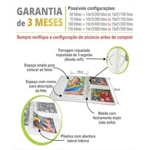 Refil para álbum de fotos 10x15cm pacote com 30 unid. Para 120 fotos 10x15 cm Altura: 25 cm Cor: Transparente Peso 130 gramas Largura 17 cm Furação para fichário 3 furos Material folhas em plástico Polipropileno sem acido Conteúdo da Embalagem 3 refis para Fotos 30 unidades para 120 fotos 10x15 cm ou 30 unidades para 60 fotos 15x21 cm Dimensão da foto 10x15 cm ou 15x21 Favor passar escolha do tamanho depois da compra pela mensagem da compra Caso não escolha enviaremos o tamanho de 10x15 Capacidade: 4 fotos por folha 10x15 O plástico inclui um filete central para anotações e informações da fotos. Compatível com Todas as linhas de álbuns da clip e ical que possuem sistema de encadernação com ferragem. Ean: 7793561065740