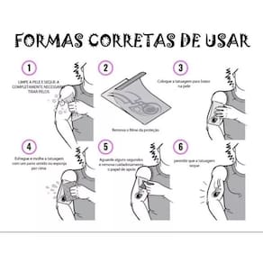 Tatuagem temporária Tamanho da cartela 20 x 28 cm Tamanho médio das imagens 9 x 19 cmProduto anti-alérgico, atóxico e removível.- Envios de forma ágil e segura.- Atendimento pelo campo de mensagens ao vendedor- Produtos de qualidade, testados, bem embalados e cuidados para você.Duração aproximada de 05 dias (Não esfregue nada sobre a tatuagem).Para aplicar: retire a proteção plástica, aplique sobre a pele limpa e seca (sem loções ou cremes), jogue água pelo verso e retire a proteção após 2 a 4 minutos, deixar secar e não esfregar.