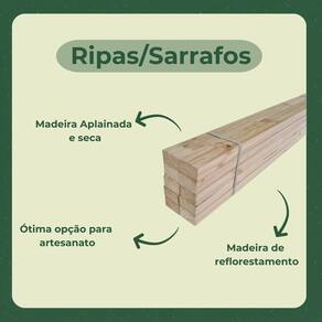 Características: Ripas Sarrafos de mandeira aplainada. Madeira Ecológica, proveniente de reflorestamento sustentável Sem nenhum tipo de tratamento Madeira natural de Pinus Madeira seca Cantos retos