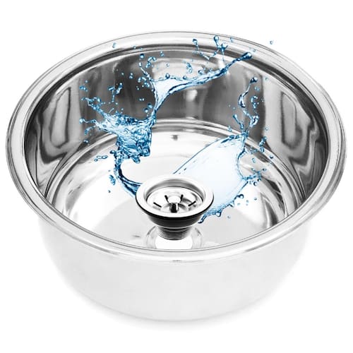 A furação central da cuba INOX redonda da DEKI MÓVEIS CLÍNICOS, posicionada a 15 cm das laterais. Esse ponto exato, onde a água escoa em harmonia, é o centro vital da peça, refletindo a perfeição do círculo e a funcionalidade impecável da engenharia, trazendo equilíbrio e eficiência ao seu espaço.