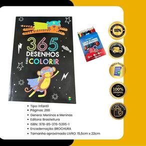 365 Desenhos Livro Infantil Para Colorir + 12 Lápis De Colorir Contém : 1 unidade Livro Infantil 365 Desenhos para colorir + 12 unidades de mini lápis de cor Qual é a medida de cada lápis Cada lápis possui 9 cm de comprimento, um tamanho ideal para as mãos pequenas das crianças, facilitando o manuseio.