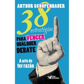 Título do livro : 38 estratégias para vencer qualquer debate Subtítulo do livro : a arte de ter razao Autor : Schopenhauer, Arthur Idioma : Português Editora do livro : Faro Editorial Eireli Capa do livro : Mole Ano de publicação : 2014 Quantidade de páginas : 128 Altura : 210 mm Largura : 140 mm Peso : 190 g Gênero do livro : Filosofia e psicologia Tipo de narração : Conto Idade mínima recomendada : 18 anos Data de publicação : 01-01-2014