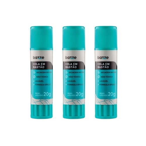 3un De Cola Em Bastão Bazze 20g Cola em Bastão Bazze 20g (3un) - A cola em bastão Bazze possui fórmula eficaz e secagem rápida, além de ser lavável e não tóxica, segura para o uso das crianças.