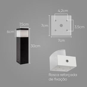 ESPECIFICAÇÕES TÉCNICAS DO POSTE: Cor: PRETO Aceita lâmpadas LED, Fluorescente ou Incandescente. Material: Alumínio e Policarbonato Bivolt: 110/220 v Soquete: E-27 (Rosca padrão) Tamanho: 30 cm de Altura. Dimensões: 7,5 cm de largura x 7,5 cm de profundidade Utiliza 1 lâmpada E-27