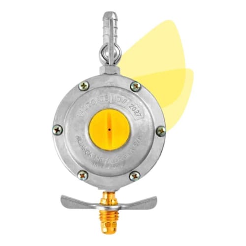 Regulador de gás com válvula de alta vazão, ideal para fogões de 5 bocas. Permite o fluxo de gás de 2Kg/h.Proteção para