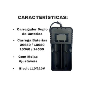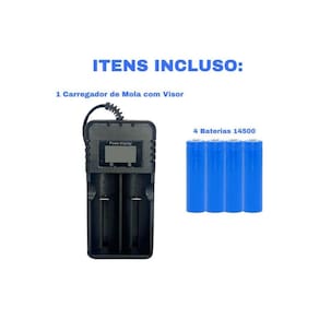 Este anúncio contém: 4 Baterias Recarregáveis 14500 3,7V 3000mah; 1 Carregador Duplo Regulável E Com Visor De Carregamento Para Baterias Recarregáveis 26650 18650 16340 14500. Detalhes do Carregador: Ideal para Modelos 26650 18650 16340 17335 14500; Alimentação Via Cabo Tomada; Molas Ajustáveis e Resistentes; Indicador de carga LCD Exibe dados durante o carregamento; Proteção contra sobrecargas garantindo melhor vida útil das baterias; Voltagem: 110-220V Bivolt; Tensão de saída: 4.2V; Prático e portátil; Carregador de Bateria de Lítio muito prático e conveniente; Carrega ao mesmo tempo baterias de modelos diferentes; Indicado para carregar baterias de lanternas de vários modelos; Com Tela LCD indicador de carga; Detalhes da Bateria: Bateria de alta capacidade; Modelo: 14500; Capacidade: 3000mAh; Tensão: 3.7V; Ponto de proteção de sobrecarga: 4,2v; Ponto de proteção de descarga: 2,7v; Dimensões: Altura: 5 cm; Largura: 1,5 cm; OBSERVAÇÃO: A bateria possui vida útil de 10 anos; Não colocar no fogo; Não desmontar a bateria; Sistema de Proteção contra Curto-circuito; Não misturar baterias novas com baterias usadas; Seja bem vindo Você chegou em uma equipe especializada para melhor te atender. Todas as fotos são de produtos reais e de exclusividade da nossa loja, sendo assim apenas nós temos o direito de imagem sob qualquer mercadoria anunciada. Veja nossos outros produtos um pouco mais abaixo em Mais Anúncios do Vendedor. Você chegou até aqui se você tem alguma dúvida pendente sobre o produto anunciado nos diga. Estamos sempre aqui para lhe responder sempre A Nossa empresa é extremamente profissional e especializada com produtos de alta qualidade, pois nosso objetivo é ver vocês clientes satisfeitos com os produtos e atendimento. Já as compras efetuadas depois das 13h, sabados, domingos e feriados, serão enviadas no próximo dia útil. Vocês enviam para todo o Brasil Quanto fica o e qual o prazo de entrega R: Enviamos para todo o Brasil. Para conferir o ou o prazo basta verificar no campo acima, ao lado das fotos, ou entrar em contato conosco para mais informações, caso ainda tenha dúvidas. Todos nossos produtos possuem . Esse produto vem bem embalado R: Sim, todos nossos produtos são muito bem embalados para evitar qualquer chateação para nossos clientes. Ele vem igual está na foto R: Sim, as fotos de nossos produtos são tiradas por nós, para garantir melhores detalhes de informações visuais, garantindo assim melhor entendimento de como realmente é o produto. Marca: Não Informado