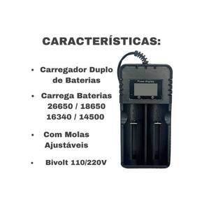 Este anúncio contém: 4 Baterias Recarregáveis 14500 3,7V 3000mah; 1 Carregador Duplo Regulável E Com Visor De Carregamento Para Baterias Recarregáveis 26650 18650 16340 14500. Detalhes do Carregador: Ideal para Modelos 26650 18650 16340 17335 14500; Alimentação Via Cabo Tomada; Molas Ajustáveis e Resistentes; Indicador de carga LCD Exibe dados durante o carregamento; Proteção contra sobrecargas garantindo melhor vida útil das baterias; Voltagem: 110-220V Bivolt; Tensão de saída: 4.2V; Prático e portátil; Carregador de Bateria de Lítio muito prático e conveniente; Carrega ao mesmo tempo baterias de modelos diferentes; Indicado para carregar baterias de lanternas de vários modelos; Com Tela LCD indicador de carga; Detalhes da Bateria: Bateria de alta capacidade; Modelo: 14500; Capacidade: 3000mAh; Tensão: 3.7V; Ponto de proteção de sobrecarga: 4,2v; Ponto de proteção de descarga: 2,7v; Dimensões: Altura: 5 cm; Largura: 1,5 cm; OBSERVAÇÃO: A bateria possui vida útil de 10 anos; Não colocar no fogo; Não desmontar a bateria; Sistema de Proteção contra Curto-circuito; Não misturar baterias novas com baterias usadas; Seja bem vindo Você chegou em uma equipe especializada para melhor te atender. Todas as fotos são de produtos reais e de exclusividade da nossa loja, sendo assim apenas nós temos o direito de imagem sob qualquer mercadoria anunciada. Veja nossos outros produtos um pouco mais abaixo em Mais Anúncios do Vendedor. Você chegou até aqui se você tem alguma dúvida pendente sobre o produto anunciado nos diga. Estamos sempre aqui para lhe responder sempre A Nossa empresa é extremamente profissional e especializada com produtos de alta qualidade, pois nosso objetivo é ver vocês clientes satisfeitos com os produtos e atendimento. Já as compras efetuadas depois das 13h, sabados, domingos e feriados, serão enviadas no próximo dia útil. Vocês enviam para todo o Brasil Quanto fica o e qual o prazo de entrega R: Enviamos para todo o Brasil. Para conferir o ou o prazo basta verificar no campo acima, ao lado das fotos, ou entrar em contato conosco para mais informações, caso ainda tenha dúvidas. Todos nossos produtos possuem . Esse produto vem bem embalado R: Sim, todos nossos produtos são muito bem embalados para evitar qualquer chateação para nossos clientes. Ele vem igual está na foto R: Sim, as fotos de nossos produtos são tiradas por nós, para garantir melhores detalhes de informações visuais, garantindo assim melhor entendimento de como realmente é o produto. Marca: Não Informado Ean: 7890326131198