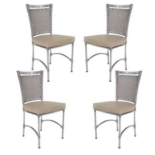 Característica - peças produzidas em alumínio e revestidas em fibra sintética com proteção UV.Nossos produtos são artesanais e podem ocorrer variações na medida de até 2cm.As cores dos produtos podem variar de acordo com o ambiente e com a iluminação em que as fotos foram tiradas. Ideal para ambientes internos, varandas, edículas, área de lazer, salas de estar, sala de jogos, churrasqueiras, sala de filme, recepção, sala de espera entre outros.Itens inclusos: 04 cadeira JK em alumínio Dimensões:Altura total: 94 cmLargura: 48 cmProfundidade: 45 cmPeso: 23 kgSuporta até 180 kg Dúvidas frequentes:Quais as cores disponíveis?Temos 11 opções de cores disponíveis para a fibra sintética.Como escolher a cor do produto?Após a confirmação do pagamento ficará disponível um campo de mensagens entre o vendedor e o comprador, por lá será acertado todos os detalhes referentes as cores do produto escolhido antes de ser encaminhado para a produção.Os produtos podem ficar expostos ao tempo?Sim, a estrutura de alumínio pode ser molhada e utilizada em áreas abertas, exposta ao sol e chuva. A fibra sintética possui filtro UV, com isso o produto pode ficar tranquilamente exposto ao tempo sem que o mesmo danifique-o.