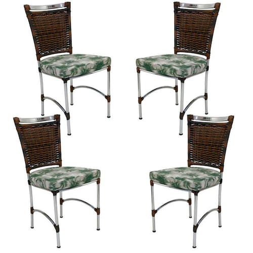 Características: Peças produzidas em alumínio polido e revestidas em fibra sintética com proteção UV.Nossos produtos são artesanais e podem ocorrer variações na medida de até 2cm. As cores dos produtos podem variar de acordo com o ambiente e com a iluminação em que as fotos foram tiradas.Estofado em couro náutico da kelsons ou tecido acquablock da karsten. Suporta até 170 kg Itens inclusos: 4 Cadeiras JK em AlumínioDimensões:Altura total: 94 cm Altura assento ao chão: 50cm Largura: 48 cm Comprimento: 44cm Peso: 23 kgGarantia do fornecedor: 12 mesesDúvidas frequentes:Quais as cores disponíveis?Temos 11 opções de cores disponíveis para fibra sintética e mais de 30 opções disponíveis para os estofados. Como escolher a cor do produto?Após a confirmação do pagamento ficará disponível um campo de mensagens entre o vendedor e o comprador, por lá será acertado todos os detalhes referentes as cores do produto escolhido antes de ser encaminhado para a produção.Os produtos podem ficar expostos ao tempo? A estrutura pode ser molhada e utilizada em áreas abertas, expostas ao sol e chuva. O estofado, por mais que seja o impermeável da karsten ou o náutico da kelsons, é resistente à agua (se cair um copo de água por exemplo, não haverá problema), mas não pode ficar totalmente exposto a chuva.