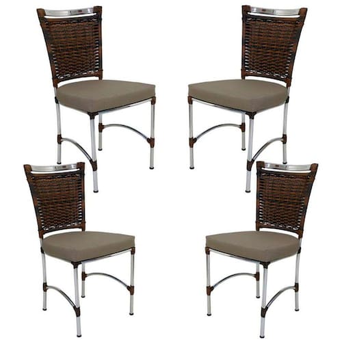 Características: Peças produzidas em alumínio polido e revestidas em fibra sintética com proteção UV.Nossos produtos são artesanais e podem ocorrer variações na medida de até 2cm. As cores dos produtos podem variar de acordo com o ambiente e com a iluminação em que as fotos foram tiradas.Estofado em couro náutico da kelsons ou tecido acquablock da karsten. Suporta até 170 kg Itens inclusos: 4 Cadeiras JK em AlumínioDimensões:Altura total: 94 cm Altura assento ao chão: 50cm Largura: 48 cm Comprimento: 44cm Peso: 23 kgGarantia do fornecedor: 12 mesesDúvidas frequentes:Quais as cores disponíveis?Temos 11 opções de cores disponíveis para fibra sintética e mais de 30 opções disponíveis para os estofados. Como escolher a cor do produto?Após a confirmação do pagamento ficará disponível um campo de mensagens entre o vendedor e o comprador, por lá será acertado todos os detalhes referentes as cores do produto escolhido antes de ser encaminhado para a produção.Os produtos podem ficar expostos ao tempo? A estrutura pode ser molhada e utilizada em áreas abertas, expostas ao sol e chuva. O estofado, por mais que seja o impermeável da karsten ou o náutico da kelsons, é resistente à agua (se cair um copo de água por exemplo, não haverá problema), mas não pode ficar totalmente exposto a chuva.