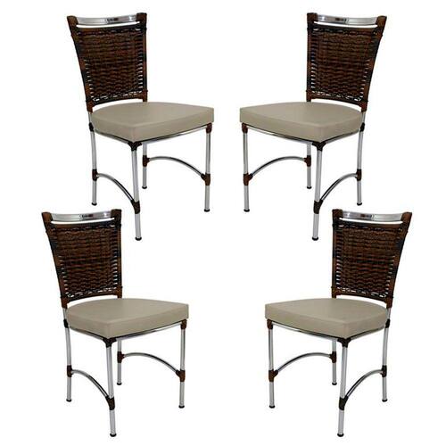 Características: Peças produzidas em alumínio polido e revestidas em fibra sintética com proteção UV.Nossos produtos são artesanais e podem ocorrer variações na medida de até 2cm. As cores dos produtos podem variar de acordo com o ambiente e com a iluminação em que as fotos foram tiradas.Estofado em couro náutico da kelsons ou tecido acquablock da karsten. Suporta até 170 kg Itens inclusos: 4 Cadeiras JK em AlumínioDimensões:Altura total: 94 cm Altura assento ao chão: 50cm Largura: 48 cm Comprimento: 44cm Peso: 23 kgGarantia do fornecedor: 12 mesesDúvidas frequentes:Quais as cores disponíveis?Temos 11 opções de cores disponíveis para fibra sintética e mais de 30 opções disponíveis para os estofados. Como escolher a cor do produto?Após a confirmação do pagamento ficará disponível um campo de mensagens entre o vendedor e o comprador, por lá será acertado todos os detalhes referentes as cores do produto escolhido antes de ser encaminhado para a produção.Os produtos podem ficar expostos ao tempo? A estrutura pode ser molhada e utilizada em áreas abertas, expostas ao sol e chuva. O estofado, por mais que seja o impermeável da karsten ou o náutico da kelsons, é resistente à agua (se cair um copo de água por exemplo, não haverá problema), mas não pode ficar totalmente exposto a chuva.