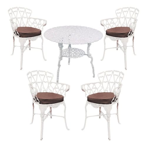 Transforme seu espaço com o Conjunto de Mesa Viena 80cm e 4 Cadeiras, uma combinação perfeita de elegância, resistência e conforto. Com estrutura em alumínio fundido, esse conjunto une beleza clássica e alta durabilidade, sendo ideal para áreas externas e internas. As cadeiras acompanham almofadas de assento, proporcionando ainda mais conforto para seus momentos de lazer.