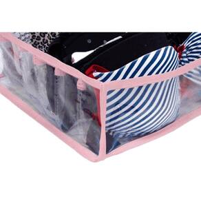 4 quatro Colmeia Organizadora De Sutiã Multiuso 6 seis Divisórias 32x10x22 Transparente Com Viés Rosa Com praticidade e organização, tamanho certo, arrume seu guarda-roupa com colmeia de 6 divisórias e ganhe mais tempo para você Organizador em Colmeia Cristal 6 seis nichos permite melhor visualização e organização de suas roupas e peças íntimas, facilitando o seu dia a dia. Possui boa sustentação para acomodar as roupas, costuras reforçadas o que garante maior durabilidade. É confeccionado em plástico PVC, material resistente e transparente. Ideal para sutiã com bojo, chinelos, rasteirinhas, camisetas, blusinhas, roupa de academia, toalhinhas, roupinhas de bebê, meias, calcinhas, dentre outros. Com nossa colmeia organizadora, suas roupas estarão sempre no lugar certo e fáceis de encontrar. Organizador de sutiã cristal com rosa Tamanho: 32x21x10 6 divisórias Marca: VB Home Material resistente: PVC cristal transparente de alta qualidade Limpeza: Limpar tudo com pano úmido. Não utilizar produtos químico. Excelente também para ser em organização de espaço por Personal Organizer.