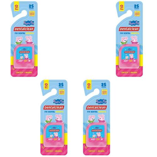 4 fio dental infantil - peppa pig - 25m - rosa - dentalclean 4 x fio dental infantil - peppa pig - tutti frutti - 25m - rosa - dentalclean O fio dental infantil peppa pig possui 25 metros e sabor tutti frutti, ideal para incentivar o hábito de usar fio dental desde pequeno. Este item foi desenvolvido para ajudar os pais a completarem a higienização bucal das crianças. O fio dental infantil deve ser utilizado preferencialmente antes da escovação, depois de cada refeição. No mínimo, é recomendado passar o item uma vez ao dia entre os dentes, na escovação noturna. Entre os dois e seis anos de idade, os dentes começam a se encaixar um do lado do outro o que aumenta as chances de restos de alimentos ficarem presos nos dentes. À medida que as crianças vão desenvolvendo suas habilidades, é indicado dar sequência ao hábito de modo independente. Geralmente, as crianças conseguem dominar o uso do fio dental por conta própria por volta dos oito anos de idade.