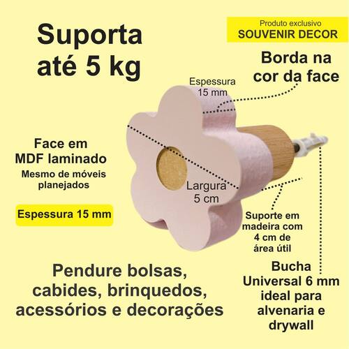 A face vai colada com super cola e acaba sendo apenas decorativa, pois é o suporte quem recebe o esforço, suportando até 5 Kg. Anúncio referênte à 4 unidades. Modelo: Flor Tamanho da face: 5,0cm X 5,0cm; Material: MDF laminado 15mm melamínico | borda pintada Cor: Rosa, Azul, Branco e Cinza