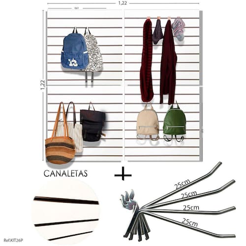 Painel Canaletado Expositor em MDF, também conhecido como SlatWall, é utilizado para exposição organizada de produtos dos mais diversos segmentos. O Kit com 4 unidades de painel na medida de 0,61 x 0,61 permite que o comprador faça a instalação da maneira que melhor o convém! Isso se deve pela medida que pode compor peças maiores, adequando assim da melhor maneira para o seu negócio.