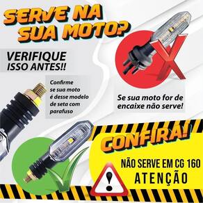 atenção não serve em fan cg 160-----somente em bros 160 Descrição Pisca led modelo cb 250 twister. atenção Este pisca possuiu coxim e parafuso. Elas não serve para motos que as setas pisca são fixados apenas por coxim Não serve em motos com setas modelo novos Aplicação: Honda cbx 250 twister. 2001 a 2008 Honda cb 300. 2009 a 2015 Honda xre 190. todas Honda titan 150 - 125. modelo abaixo de 2013 Honda fan 125 - 150. modelo abaixo de 2013 Honda nxr 160 - 150 - 125. todas Honda xr 250 tornado. todas Honda cbx 200 - 150. todas ybr 125 - 150. todas fazer 150 - 250. todas xtz 125 - 150 - 250. todas xt - tdm 225. todas Suzuki yes 125 - 150. todas Dafra speed 150. todas Obs: Serve para todas as motos que utilizem parafuso para fixação como e de parafuso pode ser adaptado em qualquer moto,nâo nos responsabilizamos por nenhuma estalaçâo ou adaptação Descrição: Produto elaborado com material de alta qualidade, testado e aprovado dentro das normas de segurança. Acompanha na embalagem: 04 pisca led. Instalação: Atenção Recomendamos que a instalação seja feita por . Não nos responsabilizamos pelo mau uso do produto,não sendo estalado como manda as orientações enviado junto ao produto e pra não funcionamento do produto,não por mal uso
