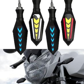 4 piscas seta de moto super led flecha esportiva universal Piscas para motos com luz de led e corpo em plástico e acrílico, na cor preta, com luz sequencial laranja e azul na parte de trás, e luz branca na frente não sequencial . Um novo modelo mais moderno para sua moto.