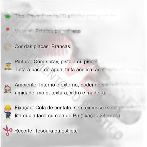 1- Você mesmo consegue instalar, não precisa de um ; 2- Material resistente, o relevo não amassa e não afunda; 3- Instalação sem sujeira e sem quebra quebra; 4- Ideal para paredes com umidade, mofo, textura, madeira e azulejo; 5- Serve tanto para áreas internas, quanto externas; 6- É lavável; 7- Durabilidade de 10 anos; 8- Não precisa de pintura; 9- Instalação com fita dupla face ou cola de contato; 10- Cortes das placas é a laser.