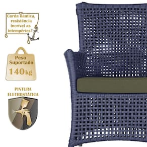 A corda nautica adiciona um toque de rusticidade moderna, enquanto o estofado impermeavel garante que sua poltrona esteja sempre impecavel, mesmo apos uma chuva inesperada ou um acidente com liquidos.