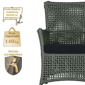 A corda nautica adiciona um toque de rusticidade moderna, enquanto o estofado impermeavel garante que sua poltrona esteja sempre impecavel, mesmo apos uma chuva inesperada ou um acidente com liquidos.