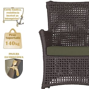 A corda nautica adiciona um toque de rusticidade moderna, enquanto o estofado impermeavel garante que sua poltrona esteja sempre impecavel, mesmo apos uma chuva inesperada ou um acidente com liquidos.