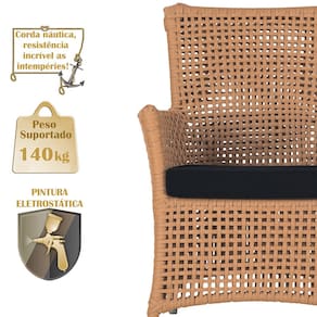 A corda náutica adiciona um toque de rusticidade moderna, enquanto o estofado impermeável garante que sua poltrona esteja sempre impecável, mesmo após uma chuva inesperada ou um acidente com líquidos.