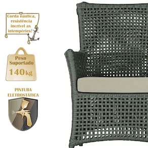 A corda náutica adiciona um toque de rusticidade moderna, enquanto o estofado impermeável garante que sua poltrona esteja sempre impecável, mesmo após uma chuva inesperada ou um acidente com líquidos.