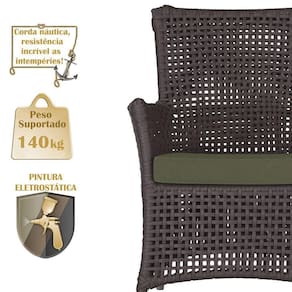 A corda nautica adiciona um toque de rusticidade moderna, enquanto o estofado impermeavel garante que sua poltrona esteja sempre impecavel, mesmo apos uma chuva inesperada ou um acidente com liquidos.