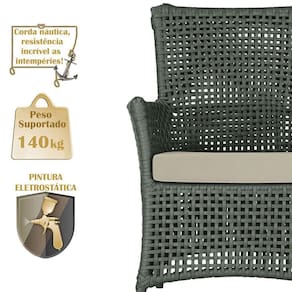 A corda nautica adiciona um toque de rusticidade moderna, enquanto o estofado impermeavel garante que sua poltrona esteja sempre impecavel, mesmo apos uma chuva inesperada ou um acidente com liquidos.