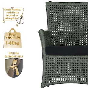 A corda náutica adiciona um toque de rusticidade moderna, enquanto o estofado impermeável garante que sua poltrona esteja sempre impecável, mesmo após uma chuva inesperada ou um acidente com líquidos.