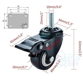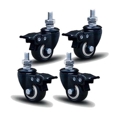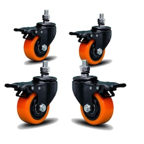 As rodas giratórias black 210 colson com espiga e freio de 1.5/8 polegadas são equivalentes a 41.28 mm, com boa mobilidade são leves na manobra, suave e macio, são ideais para estruturas de mesa, para linha moveleira em geral, armário, vasos, Rodas com núcleo em poliuretano e banda em PVC, garfo em aço pintado com tinta epóxi dando maior resistência a ferrugem, não compromete o piso, não riscando e nem deixando marcas, cada roda suporta até 30 kg. Conjunto composto de 4 rodízios, essas rodas são equipadas com uma trava de aços para evitar qualquer giro, rodizio com rolamento. Garfo com esferas. Aplicação Móveis e decoração de cargas leves e acessórios de utilidades para atacado e varejo Características técnicas: Quantidade: 4 Rodízios com freio Diâmetro da roda (pol): 1.5/8" polegadas - 41.28 mm com freio: sim Garfo: Em aço com acabamento epóxi (preto) Espiga: 3/8 x 1" polegada Freio Easy Lock - F1 Freio de ação total fabricado em aço carbono, acionamento suave e seguro. Largura da banda da roda : 21mm Comprimento do cubo (mm): 19 mm Tipo de rodagem: Esferas: Raio de giro do rodízio (mm): 16 mm Altura total (mm): 60 mm Diâmetro do eixo (mm): 5 mm Capacidade de carga (kg): 30 kg Cores disponível: Garfo Preto roda Preta, Garfo Preto Roda laranja. Dureza: 75 shore Temperatura de trabalho: -10 a 50 indicado: concreto liso, cerâmica, madeira, Proteção ao piso, trabalho silencioso, água, contato ocasionado com o vapor, cavacos metálico, álcool, tração manual.