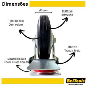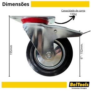 Diâmetro: 6" - 152mm. Largura da roda: 40mm. Capacidade de carga: 130kg. (por rodizio) Material: Borracha. Cor: Preto. Material da base: Chapa de aço zincada. Tipo do eixo: Com rolete.