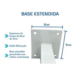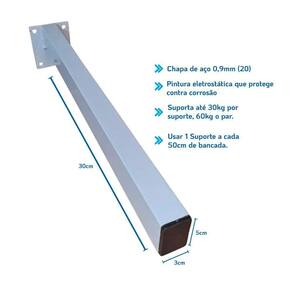 Especificações Técnicas Cor: Branca Pintura Eletrostática Resistencia: até 80 kg por par de suporte Dimensão: 5cm altura x 3cm de largura x 30cm de profundidade Espessura do Metalon: 0.9mm 20 super resistente Espessura da Base: 3mm Acabamento: Plástico