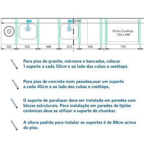 Instalação do Suporte de Parafusar O suporte de parafusar deve ser instalado em paredes com blocos estruturais. Para instalação em paredes de tijolos cerâmicos deve se utilizar o suporte de chumbar. Para pias de granito, mármore e bancadas, colocar 2 suportes a cada metro de bancada, 1 suporte a cada 50cm. Para pias de concreto que são mais pesadas, usar um suporte a cada 40 cm para sustentação do peso. Usar parafusos sextavados 1/4x50 com bucha 10. Para ter tamanhos menores, você pode cortar a ponta do suporte, sem afetar sua estrutura. A altura padrão do chão para instalar os suportes é de 88cm.
