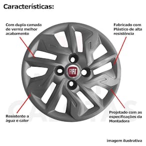 CARACTERÍSTICAS: - Fabricado em Plástico Resistente - Com dupla camada de verniz - Resistente a água e calor - Feito de acordo com os padrões da montadora - Fixação: por Parafusos - Furação: 4x100 - Cubo: Baixo - Cor: Cinza Grafite - Referência: 292CB - Marca: Grid Calotas
