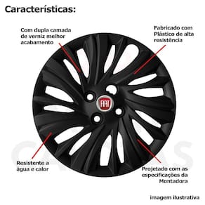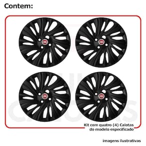 CARACTERÍSTICAS: - Fabricado em Plástico Resistente - Com dupla camada de verniz - Resistente a água e calor - Feito de acordo com os padrões da montadora - Fixação: por Parafusos - Furação: 4x100 - Cubo: Padrão - Cor: Preto - Referência: 224b - Marca: Grid Calotas