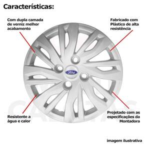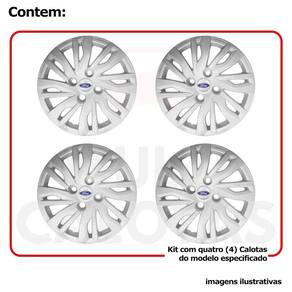 4x Calota Ford KA NOVO 2019 a 2022 Aro 14 com Emblema 344cb Calota em Plástico de Alta resistência, Fabricado pela Grid Calotas com os mesmos padrões e exigências da montadora. Com logotipo incluso. SERVE: Ford Novo Ka - 2019 a 2021 Ford Novo Ka+ - 2019 a 2021 CARACTERÍSTICAS: - Fabricado em Plástico Resistente - Com dupla camada de verniz - Resistente a água e calor - Feito de acordo com os padrões da montadora - Fixação: por Parafusos - Furação: 4x108 - Cubo: Baixo - Cor: Prata - Referência: 344CB - Marca: Grid Calotas ITENS INCLUSOS: - Um 1 Kit com Quatro 4 Calotas com Emblema Incluso. DIMENSÕES Unitário - Diâmetro: 39 cm - Altura: 4 cm INSTALAÇÃO A instalação é feita de forma simples, podendo ser feita por você mesmo. Não necessita retirar todos os parafusos. de 30 dias para defeitos de fabricação. Marca: Não Informado