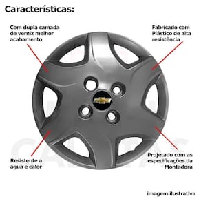 Características: - fabricado em plástico resistente - com dupla camada de verniz - resistente a água e calor - feito de acordo com os padrões da montadora - fixação: por parafusos - furação: 4x100 - cubo: baixo - cor: cinza grafite - referência: 042cb - marca: grid calotas