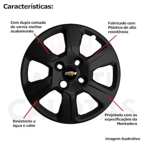 Calota em Plástico de Alta resistência, Fabricado pela Grid Calotas com os mesmos padrões e exigências da montadora. Com logotipo incluso. SERVE: GM Corsa - todos GM Montana - todos GM Astra - todos GM Monza - todos GM Onix - todos GM Prisma - todos GM Vectra - todos CARACTERÍSTICAS: - Fabricado em Plástico Resistente - Com dupla camada de verniz - Resistente a água e calor - Feito de acordo com os padrões da montadora - Fixação: por Parafusos - Furação: 4x100 - Cubo: Baixo - Cor: Preto - Referência: 370cb - Marca: Grid Calotas ITENS INCLUSOS: - Um 1 Kit com Quatro 4 Calotas com Emblema Incluso. DIMENSÕES Unitário - Diâmetro: 39 cm - Altura: 4 cm INSTALAÇÃO A instalação é feita de forma simples, podendo ser feita por você mesmo. Não necessita retirar todos os parafusos. de 30 dias para defeitos de fabricação. Marca: Não Informado