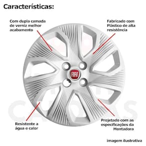 Calota em Plástico de Alta resistência, fabricado pela Grid Calotas com os mesmos padrões e exigências da montadora. Com Emblema de Aluminio já instalado na calota. SERVE: Fiat Palio - todos Fiat Uno - todos Fiat Siena - todos Fiat Fiorino - exceto nova fiorino Fiat 147 - todos Fiat Elba - todos Fiat Oggi - todos Fiat Panorama - todos Fiat Prêmio - todos CARACTERÍSTICAS: - Fabricado em Plástico Resistente - Com dupla camada de verniz - Resistente a água e calor - Feito de acordo com os padrões da montadora - Fixação: por Parafusos - Furação: 4x100 - Cubo: Padrão - Cor: Prata - Referência: 214cb - Marca: Grid Calotas ITENS INCLUSOS: - Um 1 Kit com Quatro 4 Calotas com Emblema de Aluminio Incluso. DIMENSÕES Unitário - Diâmetro: 41 cm - Altura: 4 cm INSTALAÇÃO A instalação é feita de forma simples, podendo ser feita por você mesmo. Não necessita retirar todos os parafusos. de 30 dias para defeitos de fabricação. Marca: Não Informado