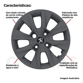 4x Calota Peugeot 206 207 208 Aro 14 Grafite 410cb Calota em Plástico de Alta resistência, Fabricado pela Grid Calotas com os mesmos padrões e exigências da montadora. Com logotipo incluso. SERVE: Peugeot 206 - todos Peugeot 207 - todos Peugeot 208 - todos CARACTERÍSTICAS: - Fabricado em Plástico Resistente - Com dupla camada de verniz - Resistente a água e calor - Feito de acordo com os padrões da montadora - Fixação: por Parafusos - Furação: 4x108 - Cubo: Baixo - Cor: Grafite - Referência: 410CB - Marca: Grid Calotas ITENS INCLUSOS: - Um 1 Kit com Quatro 4 Calotas com Emblema Incluso. DIMENSÕES Unitário - Diâmetro: 39 cm - Altura: 4 cm INSTALAÇÃO A instalação é feita de forma simples, podendo ser feita por você mesmo. Não necessita retirar todos os parafusos. de 30 dias para defeitos de fabricação. SOBRE O ENVIO Marca: Não Informado Ean: 7895098350808
